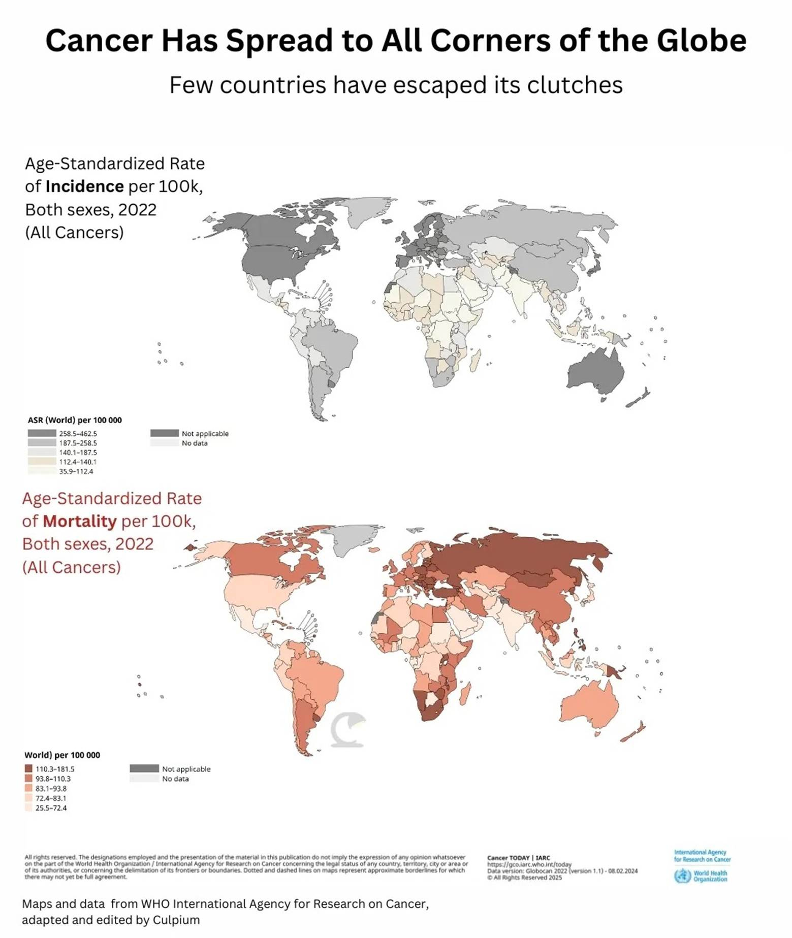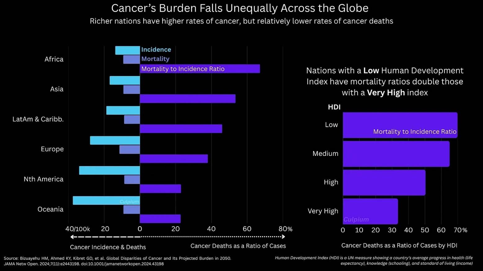 儘管醫療研究持續進步,本世紀下一季度罹癌率預計攀升百分之六十來到每年三千零五十萬例,死亡率預計上升至百分之七十五來到每年一千八百六十萬例,「首次確診和三分之二的死亡數會發生在中低收入國家。」Institute for Health Metrics and Evaluation 如此撰寫, The Lancet 節錄。