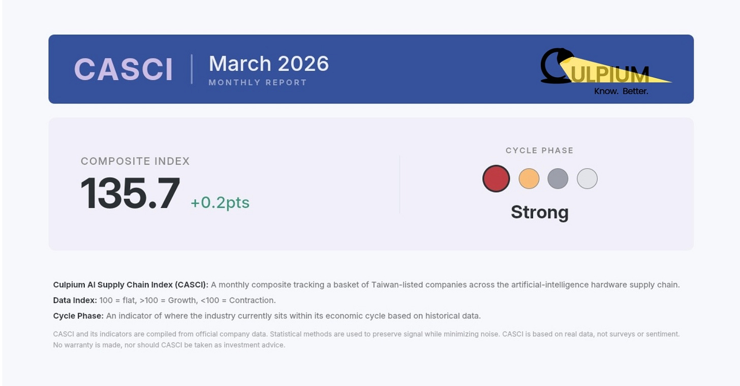 Media and analysts are welcome to cite CASCI or the Culpium AI Supply Chain index, with attribution and link. For example, “AI server manufacturing remains strong, according to the latest CASCI report from Culpium.”