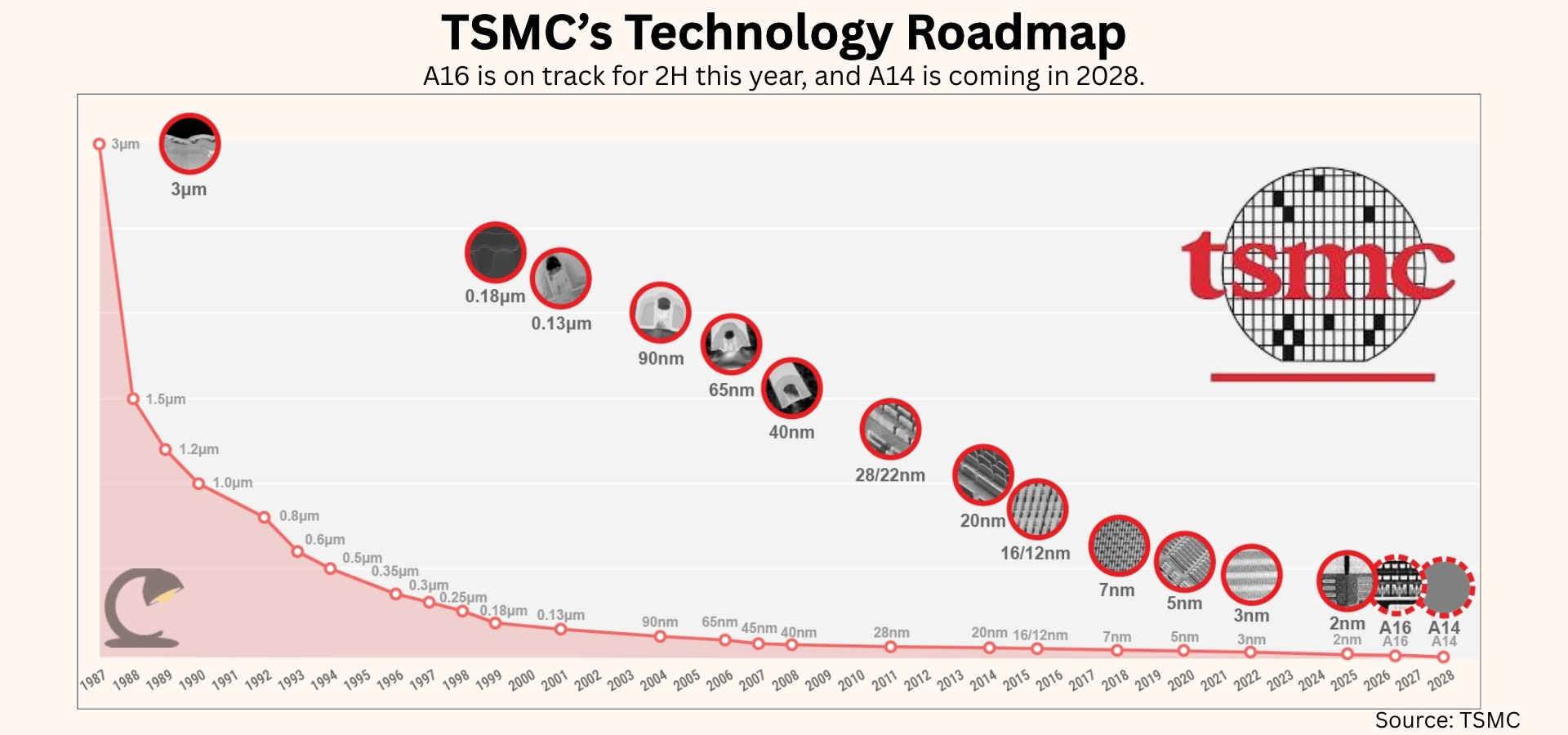 TSMC is already producing chips in volume at 2 nanometer (called N2), currently its most advanced node, with Apple a major buyer. But in the second half of this year it’s set to ramp up both a new variant called N2P as well as a new node called A16.