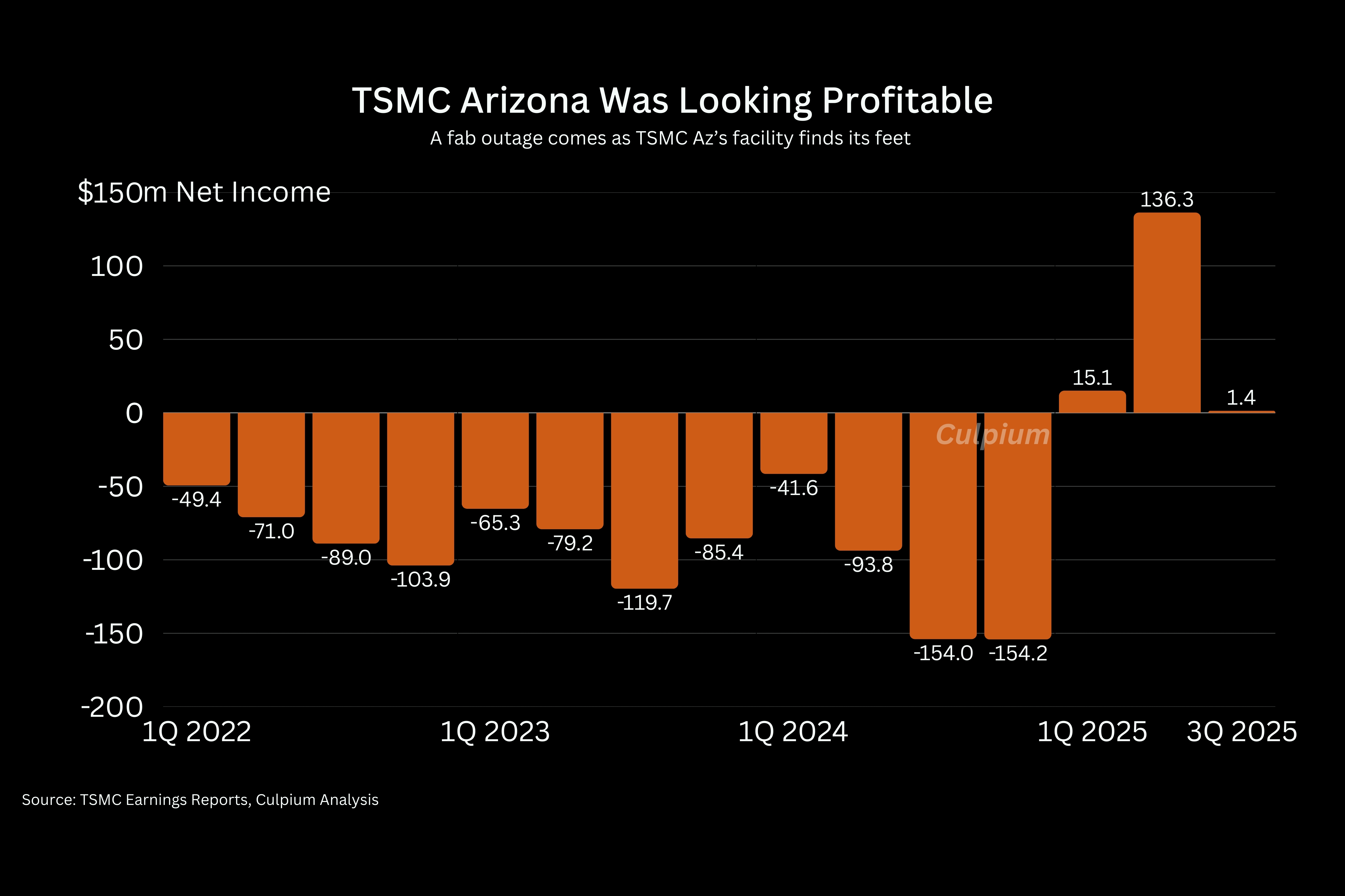 Profit margins on new facilities and at new nodes tend to be quite thin, even negative. In addition, TSMC has been ramping up capacity in Arizona and that capex gets reflected in depreciation costs even before the new equipment can start producing revenue. So it’s reasonable to see fluctuations in net income at the site. A halt in production and scrapping of wafers adds to the costs, dragging on earnings even if only slightly and briefly.