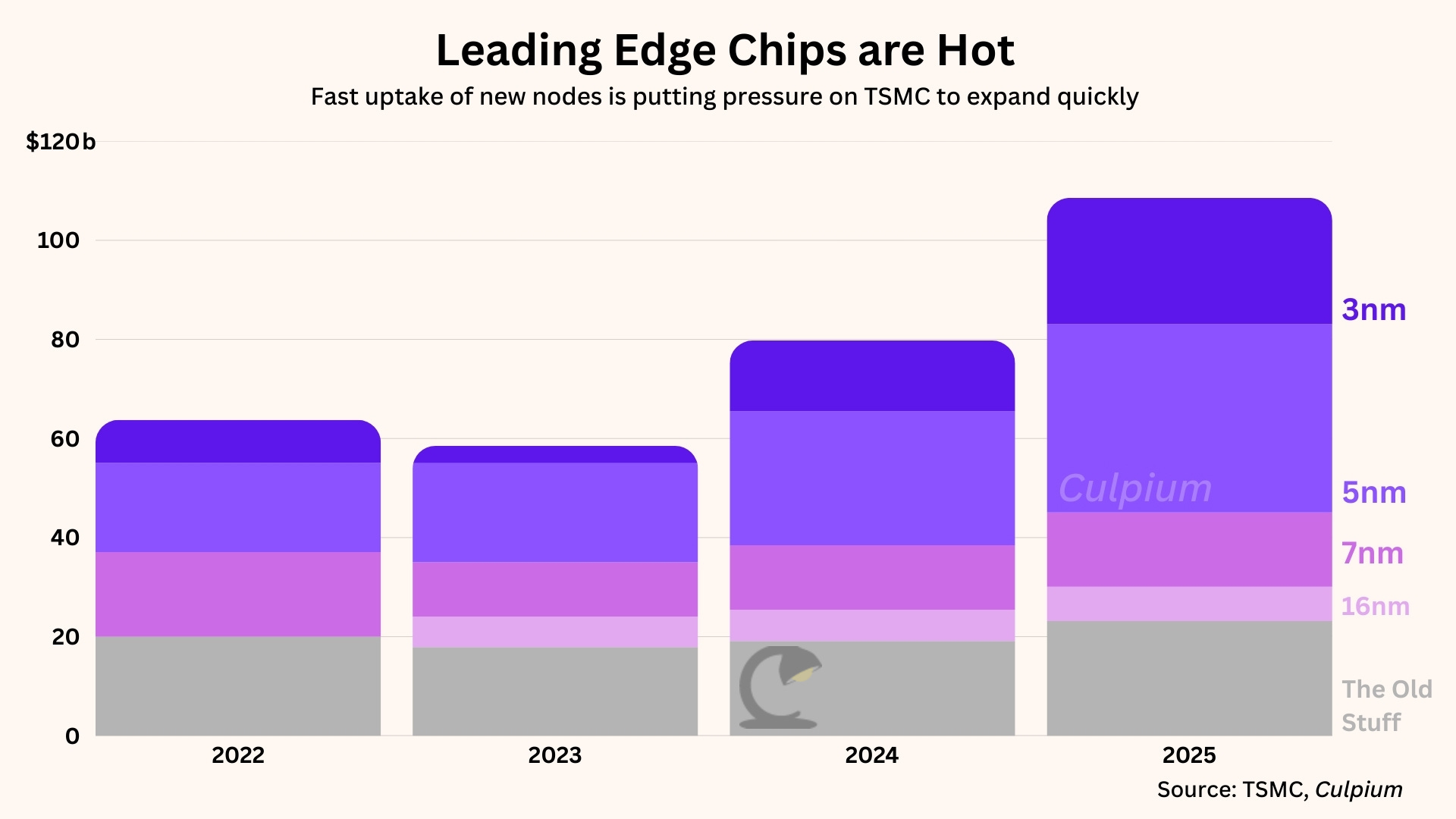 Culpium is the first to report that N2 is now close to facing the same level of capacity constraint well into next year and beyond. TSMC’s N3 node was launched in 2022 with revenue from the technology almost doubling last year to $25 billion. N2, on the other hand, hit volume production only in the past six months. Apple is the first customer and is initially using the node for chips that will go into its upcoming MacBook, I am told.